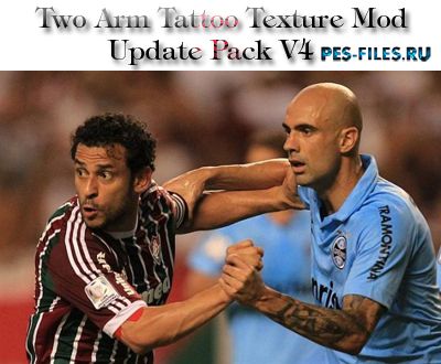 Two Arm Tattoo Texture Mod Update Pack V4 - хорошего качества пак, в котором собрано небольшой количество лиц и тату для футболистов из разных футбольных клубов для футбольного клуба PES 2013. В данном паке вы найдете реальные татуировки футболистов, а так же лица, которые очень похожи на реальные фейсы