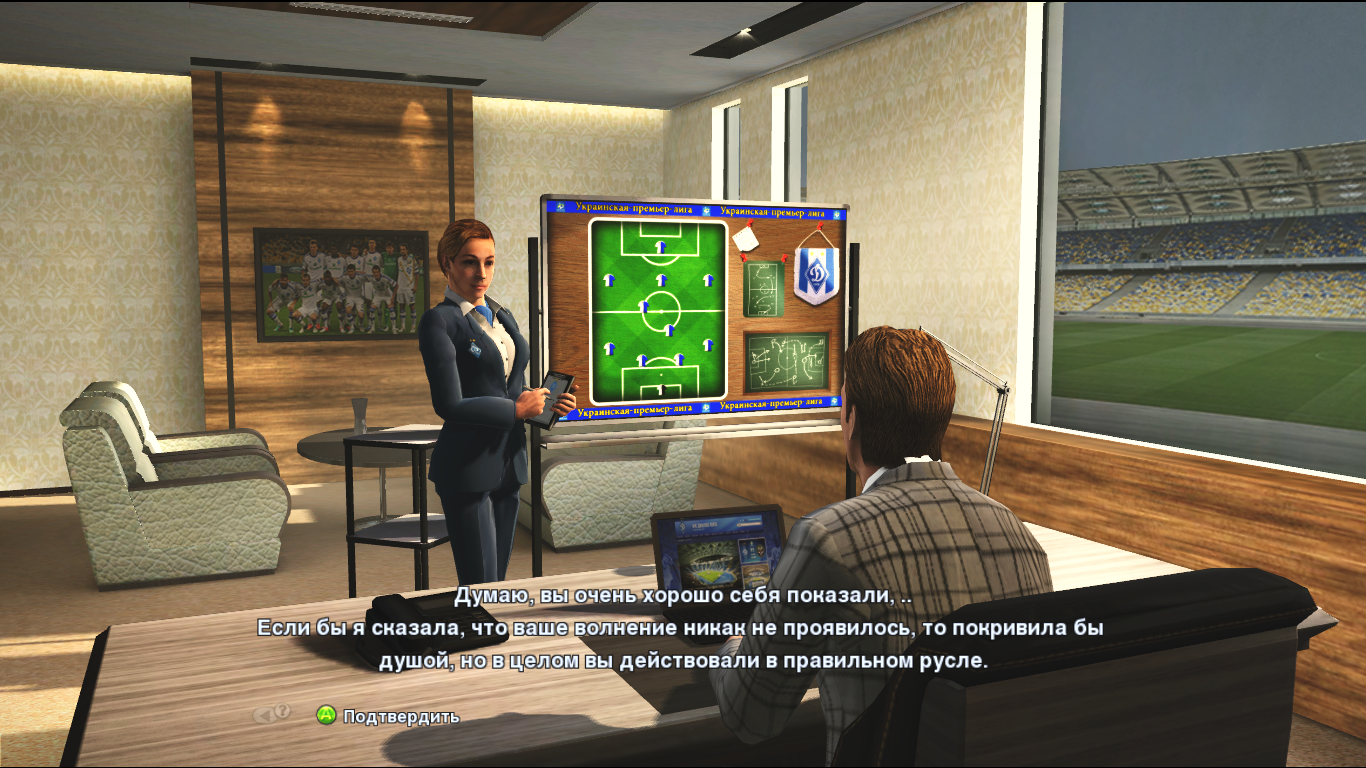 Manager room Dynamo Kiev - красивое дополнения для итак отличного футбольного симулятора PES 2013, которое изменит комнату, в которой происходит встреча главного тренера с менеджером команды в режиме "Мастер Лига". Manager room Dynamo Kiev не только перекрасит комнату в стиль гранда украинского футбола, но и добавит стадион за окном, а так же фото команды, которое виднеется на заднем плане
