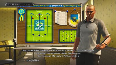 Представляем очередное, такого рода, графическое дополнения, которое добавит в вашу игру замечательную комнату тренера, в которой его помощник рассказывает о сопернике. В данной комнате все было сделано в стиле Украинской Премьер Лиги, а если быть точнее, то с уклоном на сборную Украины. За окном вы можете увидеть тренировочную базу национальной сборной