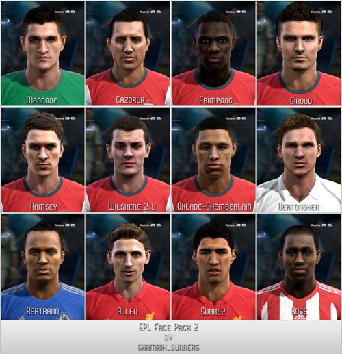 EPL Face Pack version № 2 - второй фейспак футболистов английской премьер лиги, выполненный в супер качестве для футбольного симулятора PES 2013. Стоит отметить, что все лица сделаны в HD качестве, и у каждого игрока присутствует своя, уникальная прическа, что добавляет ему схожести с настоящими футболистами