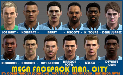 MEGA FACE-PACK HD MANCHESTER CITY - супер, мегафейспак лиц, в котором собраны лицо многих футболистов, которые защищают цвета футбольного клуба "Манчестер Сити". Это своего рода уникальный фейспак, который вы больше не найдете нигде, кроме как в патчах для PES. Лица сделаны в HD качестве, что придает им такой долгожданной реальности
