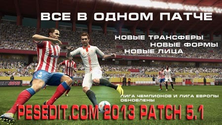 PESEdit.com 2013 Patch 5.1 - лучший патч для футбольного симулятора PES 2013, который добавит в вашу игру множество новых футболистов, лиц, стадионов, полностью обновит графику, проведет все последние трансферы, и все это совершенно бесплатно, просто скачав патч PESEdit.com 2013 Patch 5.1 для PES 2013