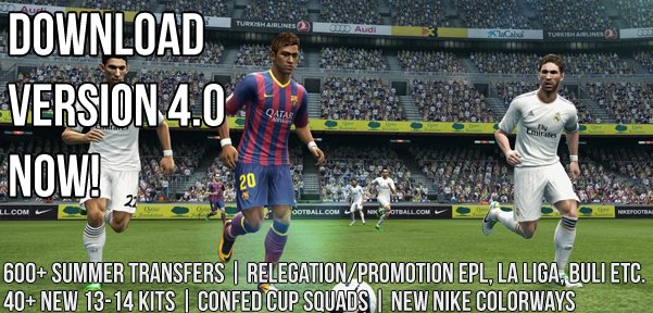 PESEDIT.COM 2013 PATCH 4.0 - очередная, уже четвертая версия самого популярного патча для PES 2014 от известного сайтаPESEDIT.COM В данной версии авторы провели все самые последние трансферы, добавили много разных дополнений, которые насыщают игру новыми ощущениями, которые порадуют каждого фаната игры.