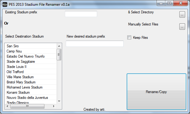 PES 2013 Stadium Files Renamer - программа, которая поможет вам с легкостью переименовать любой стадион в футбольном симуляторе PES 2013 или другие части, который используются в игре. Данная программа поможет вам изменить ту информацию, которая не отвечает действительности или не оправдывает ваших ожиданий