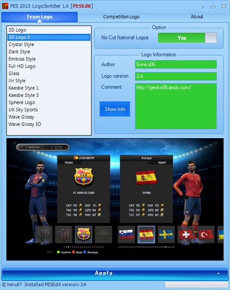 LogoSwitcher 1.6 for PESEdit - очередная версия салектора для выбора HD логотипов национальных сборных и клубов в патче PESEdit. Благодаря данному салектору, вы сможете придать игре очень много разнообразия, которого так не хватает в стандартной версии PES