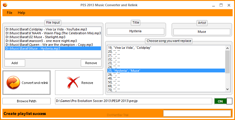 Music Converter and Relink - программа, с помощью которой вы сможете сконвертировать любую песню в ваш PES 2013. Вы сможете не только добавить песню в игру, но и дать ей названия, отредактировать как вас захочется. В общем отличная программа для начинающий мейкеров, ибо в использовании она очень проста